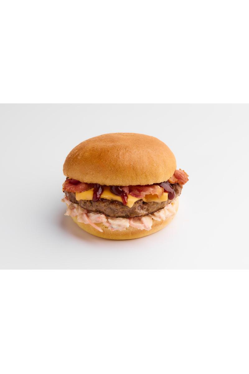 Standard tilbehør: Ost, bacon, Bbq saus, Coleslaw. Inneholder: Egg, melk, hvete, sennep, sulfitt. Kan inneholde nøtter, sesam og soya
