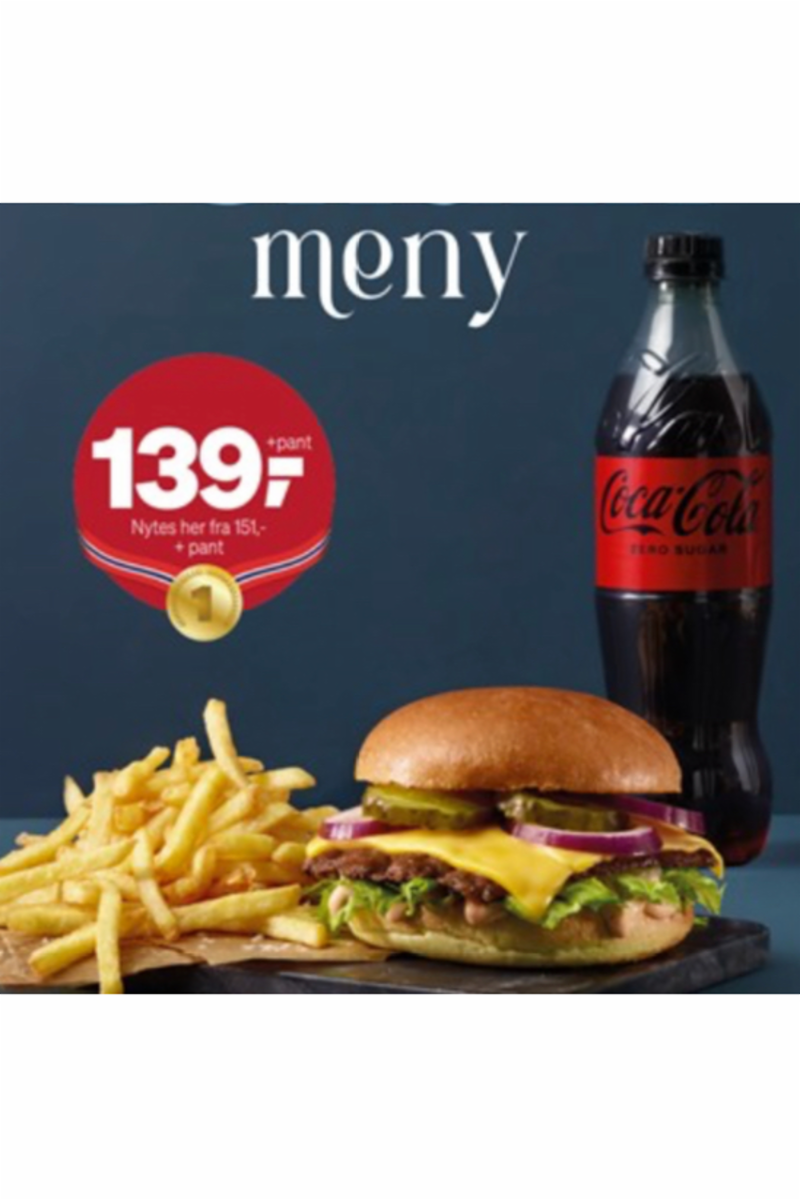 100g Smashburger, fries og 0,5l drikke. Standard tilbehør: Ost, Salat, dressing, rødløk og sylteagurk. Inneholder: hvete, egg, melk og sennep. Kan inneholde spor av sesamfrø og soya.